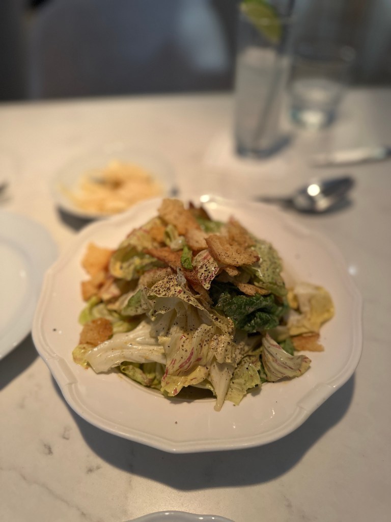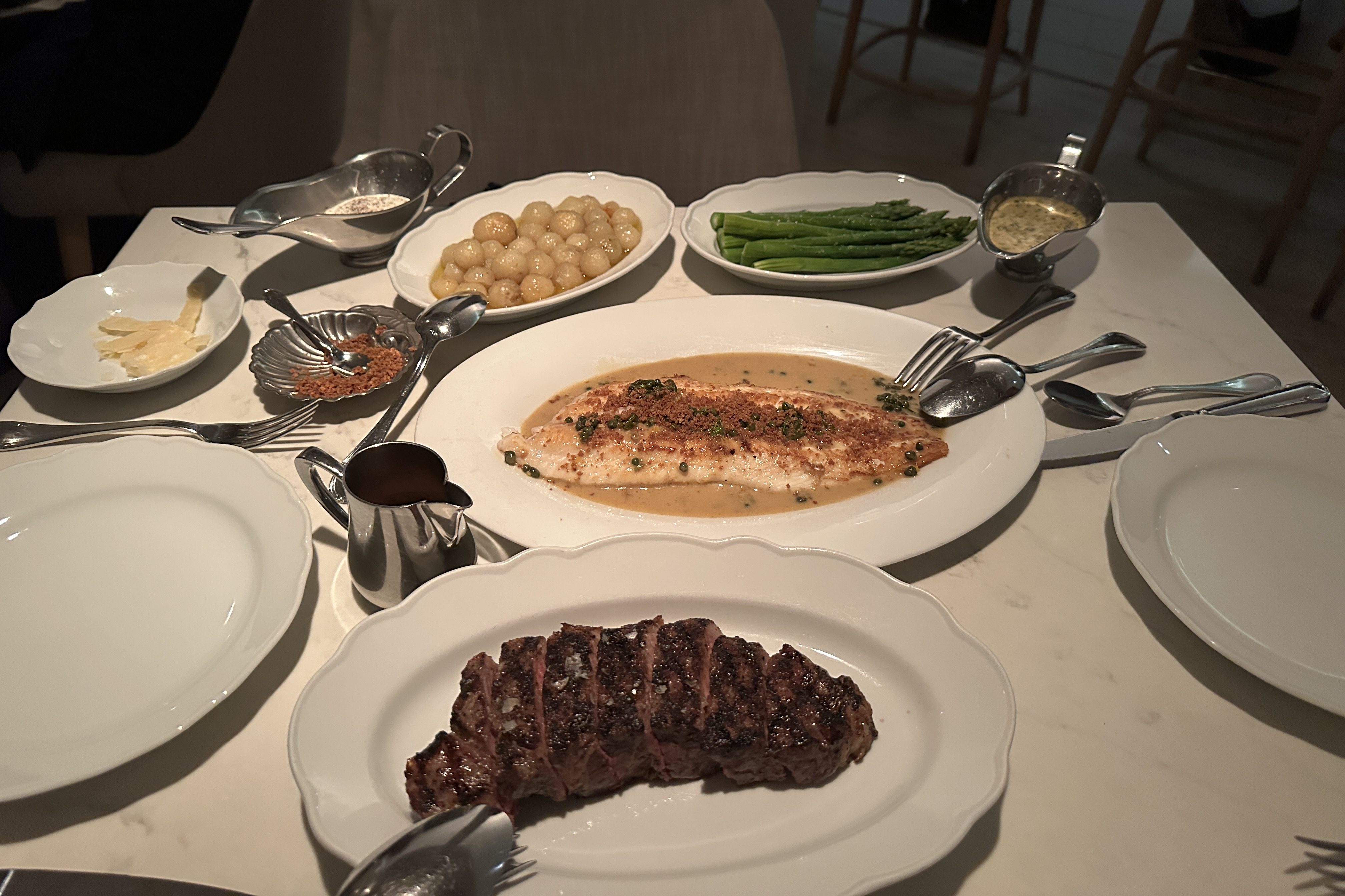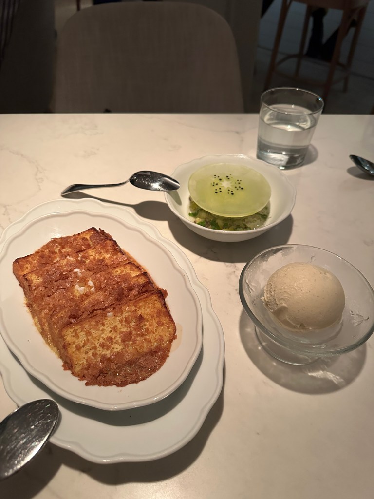Upon entry we were greeted and seated in the middle of the dining room. I wouldn’t award them any special points for ambiance but the tall loft-style ceilings and modern white aesthetic made the relatively small dining room feel spacious. Our server just so happened to be the manager (lucky us!) and was very kind and attentive, especially with regard to our dietary restrictions. We ordered the radicchio salad, dover sole, steak, potatoes, and asparagus. Mom also had the onion tartine (which neither Dad nor I dared to try since we’re onion intolerant) but she said it was fantastic. In classic Michelin-style, our first course was a lovely and tasty little amuse-bouche. The second course of passionfruit caesar was surprisingly delicious. I wasn’t expecting much because a caesar salad is a caesar salad, but the addition of the passionfruit and radicchio gave it a pleasantly unique flavor. Each of our main dishes were excellent. The sole was beautifully filleted and presented table side, the steak was flavorful, the potatoes were superb, the asparagus was perfectly fresh and crisp, and in true French style, the accompanying sauces were magnificent. For dessert, we ordered the kiwi and bread pudding. The kiwi was beautifully presented, light, and refreshing. The bread pudding was also uniquely presented, more as a French toast than in the traditional style. Although it tasted less like bread pudding and more like soufflé, it was delightful.